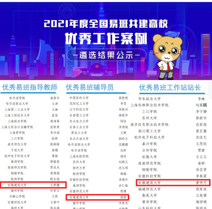近年来,学校易班以“贴近学生、着眼发展、融合服务、浸润教育”为建设标准,从制度探索、人员引进、内容建设、场地谋划等方面精准发力,充分发挥易班网络平台在大学生思想教育方面的优势,凝聚合力,深挖内涵,多措并举,真抓实干,积极探索大学生网络思想政治教育内容、载体、模式和机制创新,着力筑牢学校网络思想文化的重要阵地,加强“融媒体+思政”建设,催生了丰硕的育人成果,在安徽省多项易班评优和活动中表现优异。其中,在2021年安徽省易班评优中,我校荣获安徽省优秀易班共建高校、优秀易班指导老师等多项荣誉,并经安徽省推荐,在教育部组织的全国易班共建高校优秀工作案例评选中获奖。