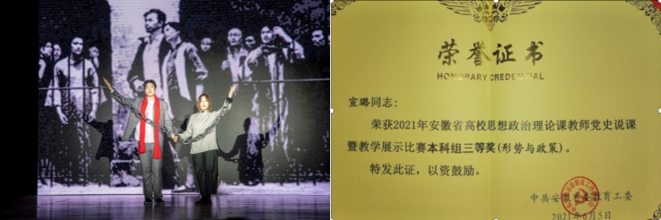 支部党员在高质量完成教学任务的同时,注重教学经验总结和教育能力提升。在教学效果方面,2020年以来支部党员获得省级教学成果一等奖、三等奖各一项,获得教研项目12项;支部党员积极参加教学竞赛,提高教学技能,站稳思政课堂,在安徽省思政课相关比赛中先后获省级二等奖1项,三等奖2项,2021年宣璐同志《爱国与爱党爱社会主义的统一》入围安徽省高校精品示范思政建设。在课程内涵建设上,通过组织学生参与“追寻红色足迹”“红色情景剧”“大学生讲思政课”“大学生微电影展示”等新颖的学生活动,逐渐形成了“一课一品”课程特色。这些活动既是思政课教学综合改革有效探索,也是思想政治教育实施全员、全过程、全方位育人的具体举措。