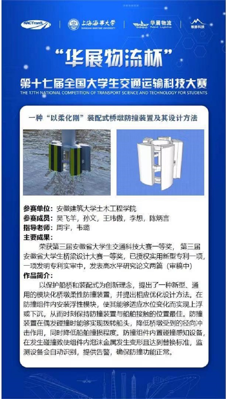 本网讯 7月9日至10日,“华展物流杯”第十七届全国大学生交通运输科技大赛在上海海事大学举行。我校土木学院参赛作品《一种“以柔化刚”装配式桥墩防撞装置及其设计方法》荣获三等奖。