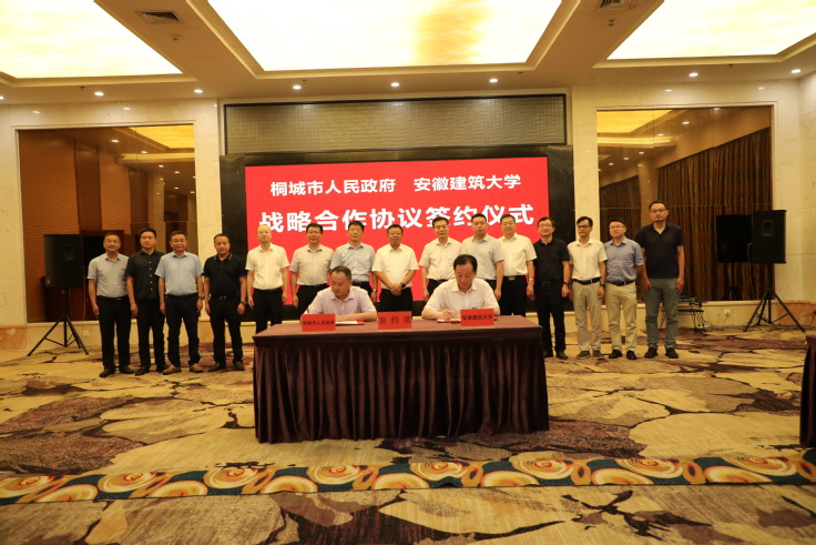 本网讯 7月15日,校党委副书记、校长黄显怀,校党委常委、副校长蔡新立率队赴桐城市签订战略合作协议。桐城市委书记章周中,市委常委、副市长章友厚,市委常委、组织部长储江,以及学校办公室、科学技术处、科技成果转化中心、土木工程学院、建筑与规划学院、经济与管理学院相关人员参加了签约仪式。