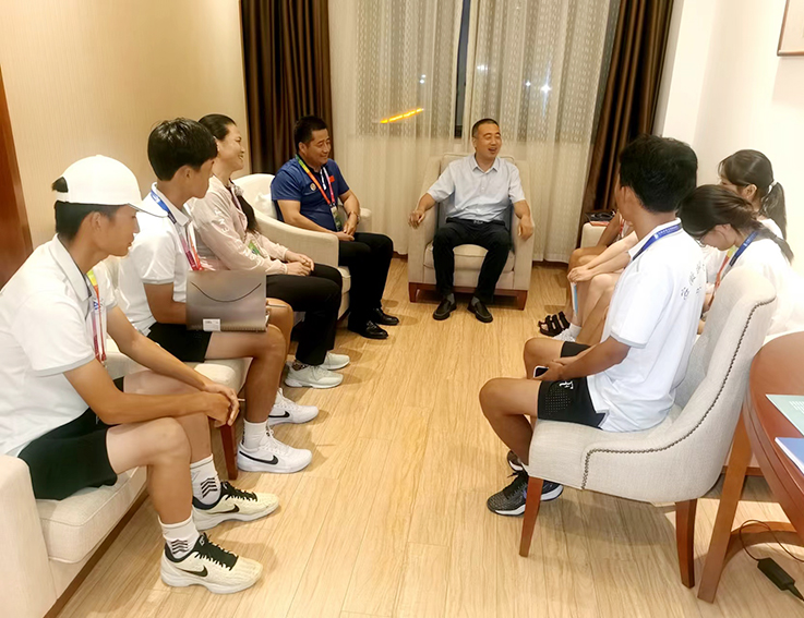 体育部负责人和教练汇报了赛事要求、参赛项目、赛前准备、运动员的竞技状态、场地适应以及在驻地生活等相关情况。闵杰仔细听取了汇报,并同现场队员进行了深入交流。