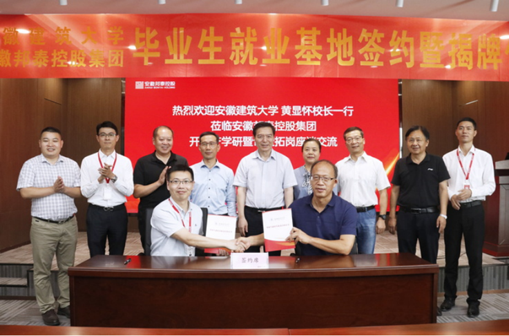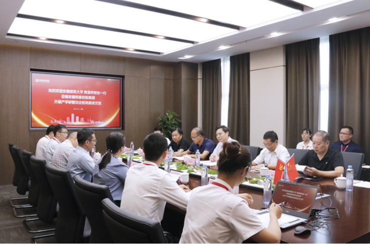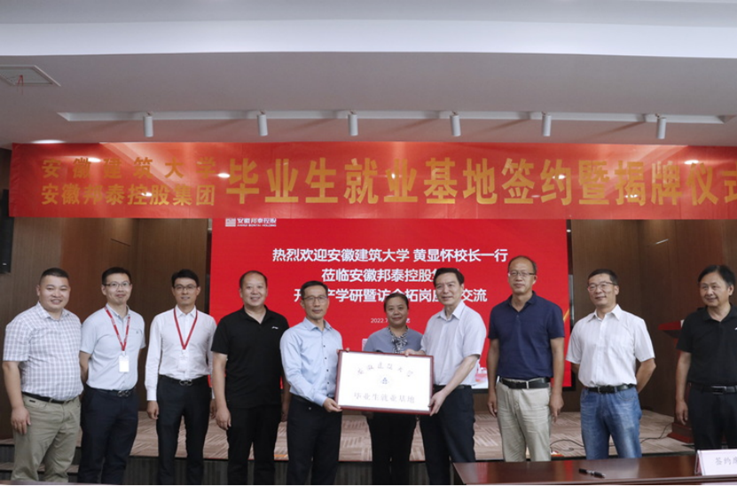 本网讯 7月21日,校党委副书记、校长黄显怀率就业工作处、国际交流合作处、环境与能源工程学院相关负责人走访安徽邦泰控股集团有限公司,开展产学研合作暨访企拓岗促就业座谈交流。安徽邦泰控股集团董事长陈齐、副总裁金永春、企业相关负责人及校友代表参加了座谈交流。
