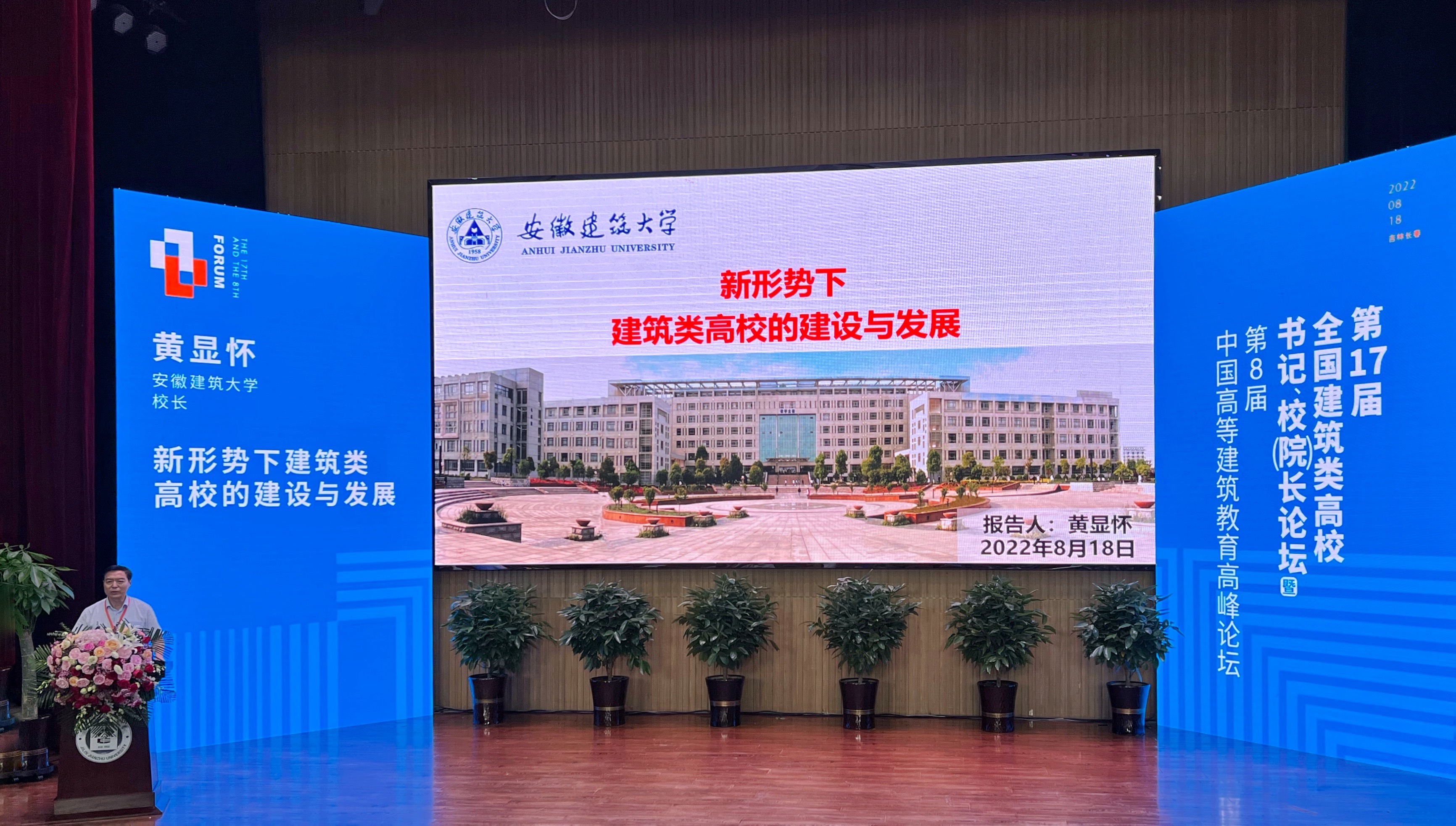 本网讯 8月18日,第17届全国建筑类高校书记、校(院)长论坛暨第8届中国高等建筑教育高峰论坛在吉林建筑大学举行,本次论坛的主题是“新时代建筑类高校教育改革与创新”。住房和城乡建设部人事司副司长何志方、吉林省教育厅党组书记、厅长张洪彬、中国建筑工业出版社社长高延伟等同志,北京建筑大学、西安建筑科技大学、天津城建大学、沈阳建筑大学、山东建筑大学等近20所高校的书记、校(院)长齐聚一堂,共谋发展。校党委副书记、校长黄显怀,校党委常委、副校长蔡国军率领相关部门参加论坛,会上,黄显怀受邀发表《新形势下建筑类高校的建设与发展》主旨演讲。