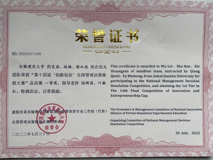 日前,2022年第十四届“创新创业”全国管理决策模拟大赛总决赛落下帷幕。经过校赛、大区赛、大区复活赛、全国半决赛、总决赛激烈角逐,学院强群莉和叶敏红指导,吴磊、疏楠、谢双燕三人组成的“光”团队从128个参加全国总决赛的代表队中脱颖而出荣获全国总决赛一等奖。