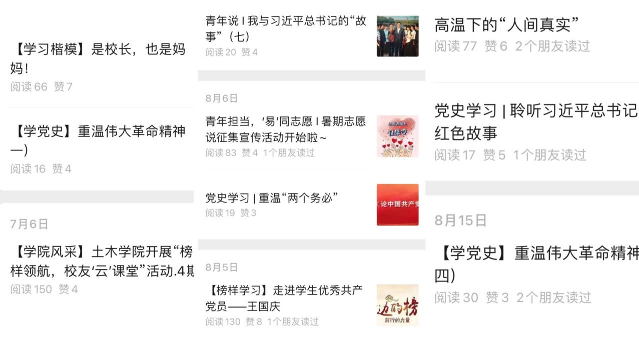 牢牢把握网络思政教育主阵地是深化立德树人根本任务的重要途径,为强化全方位育人成效,切实推进大学生思想政治教育。土木学院新媒体中心暑期坚持网络思政建设,定期开展《论中国共产党历史》《习近平与大学生朋友们》《重温伟大革命精神》等党史学习教育,巩固党史学习成果,强化历史担当;主动宣传时代楷模、优秀学生共产党员等榜样人物,积极发挥榜样示范引领,弘扬新时代青年担当。同时组织开展了“‘青’扬乡美,‘易’展乡情”摄影作品征集、青年担当,‘易’同志愿——暑期志愿说等活动,积极引导同学们集青春力量展现家乡情怀,服务家乡、回报社会。