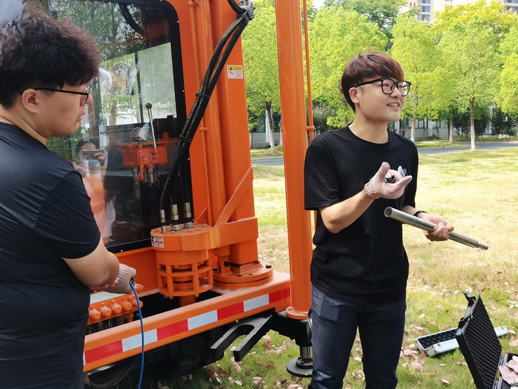 在南校区土木楼一楼外草坪,蔡国军为2022级研究生新生讲解了现代多功能孔压静力触探(CPTU)测试装备,东南大学刘薛宁博士生详细介绍了多功能探头系统以及数据采集系统。在履带静探车前,东南大学原位测试课题组成员一边演示一边讲解多功能CPTU探头的用法以及车载装置上的功能用处。在一番演示后,建大研究生新生也尝试学习如何使用CPTU现代原位测试技术,遇到问题时,不时向老师们询问。