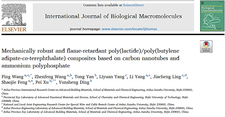 近日,我校材料科学与化学工程学院本科生王振峰在导师王平副教授的指导下,在国际著名期刊《International Journal of Biological Macromolecules》(IF=8.03,中科院1区(化学TOP期刊)上发表题为《Mechanically robust and flame-retardant poly(lactide)/poly(butylene adipate-co-terephthalate) composites based on carbon nanotubes and ammonium polyphosphate》(doi.org/10.1016/j.ijbiomac.2022.09.033.)的研究论文,该论文是王振峰同学本科毕业论文成果的总结和凝练。