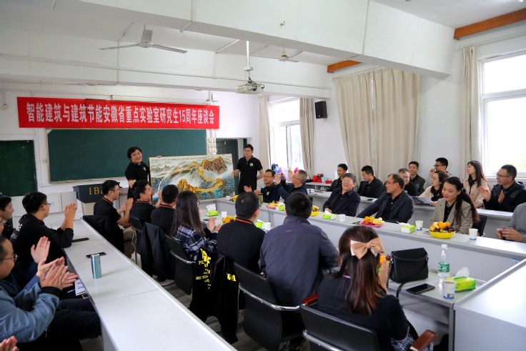本网讯 时光荏苒,师恩不忘。近日,学校智能建筑与建筑节能安徽省重点实验室十五届近50名研究生校友重返母校,参加实验室十五周年庆祝活动。校督导员、智能建筑与建筑节能安徽省重点实验室主任、博士生导师方潜生教授,电子与信息工程学院党委书记孙长城,副院长杨亚龙,党委副书记丁媛媛与实验室在读研究生一起参与了本次活动。