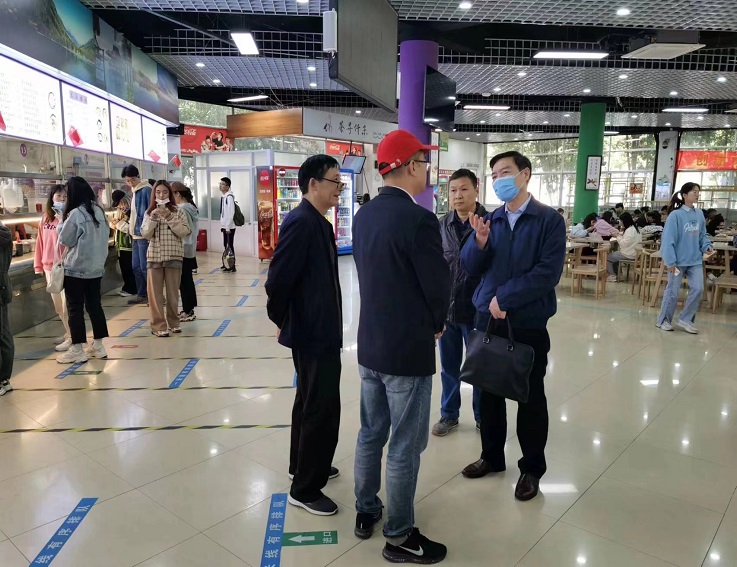 在北校区学生食堂一楼,黄显怀详细了解食堂食品采购、贮存、加工、售卖等具体流程状况,仔细询问餐具消毒、饭菜价格、餐品种类等工作细节,认真查看食品出入库台账、消毒台账、食品留样等记录,对食堂存在问题现场提出建设性意见。黄显怀指出,学校食堂集中就餐的人流量大,特别是在做好疫情防控工作的前提下,食品安全责任重大。他强调,一是要时刻绷紧食品安全生产这根弦,确保师生饮食卫生安全;二是对于工作中发现的各种问题,要立即整改,共性问题举一反三,及时建立问题清单;三是要定期对餐饮员工进行集中教育,让师生吃的满意,吃的放心。