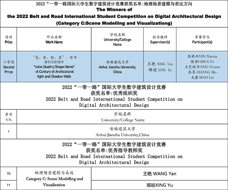 10月28日,由联合国教科文组织支持、“一带一路”建筑类大学国际联盟发起、北京建筑大学主办的2022“一带一路”国际大学生数字建筑设计竞赛结果揭晓,艺术学院研究生、本科生共同创作的作品《“色、质、形、名”—百年建筑光影漫步》在地理场景建模与表达方向荣获二等奖,ku游官方荣获“优秀组织奖”,邢瑜、王艳老师获得“优秀指导教师”荣誉称号。
