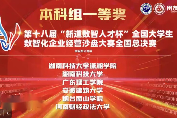 11月5日,第十八届“新道数智人才杯”全国大学生数智化企业经营沙盘大赛总决赛落下帷幕。经管学院韦建康、刘伟、卞晓倩、赵启赞组建的团队在朱素媛老师的精心指导下,与北京航空航天大学、苏州大学、贵州大学等高校同台竞争,从来自全国30个省(市)高校的143支参加总决赛的队伍中脱颖而出,荣获全国总决赛一等奖!