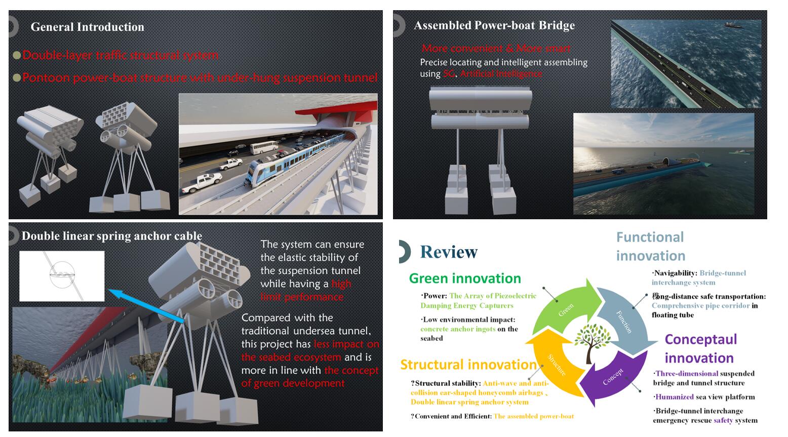 土木工程学院获奖作品以“铁路——架起’丝路’新纽带”为主题,以“数字建造”思维设计铁路及沿线城市的历史文脉延续、综合品质提升与可持续发展,旨在解决跨百公里级公铁两用跨海交通系统创新。作品结合跨海浮桥与悬浮隧道各结构优势,实现长距离跨海峡交通与海床施工低影响开发,为跨越领土内海峡建造交通基础设施,奠定技术思路与创新基础。