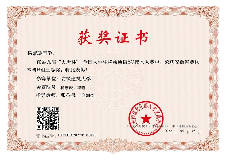 近日,第九届“大唐杯”全国大学生新一代信息通信技术大赛全国总决赛圆满结束。我校电子与信息工程学院组织参赛的2支队伍全部获奖,分别荣获安徽赛区一等奖1项,三等奖1项,并晋级全国总决赛,荣获全国赛区三等奖1项。