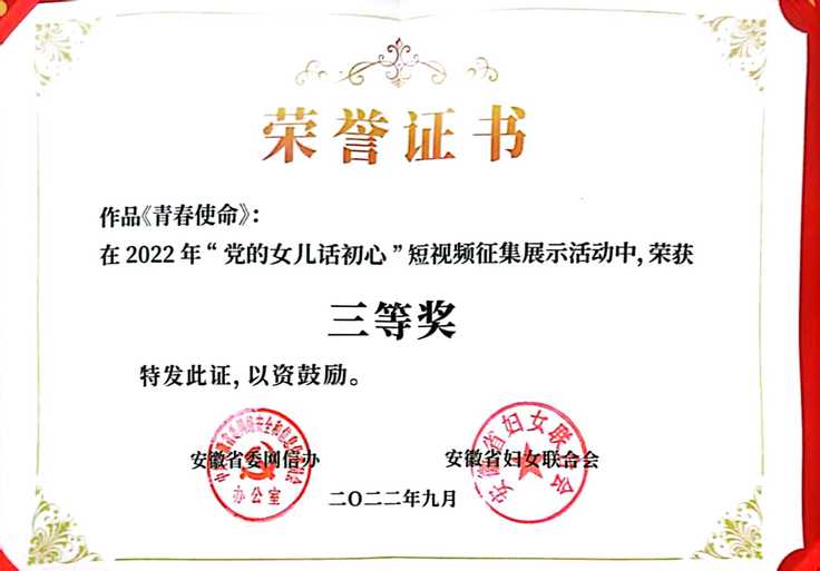 近日,由安徽省委网信办、安徽省妇联联合举办的“党的女儿话初心”视频比赛结果揭晓,本次比赛面向全国,共设一等奖1名,二等奖2名,三等奖3名。外国语学院师生创作的视频作品《青春 使命》从近百件参赛作品出脱颖而出,获得三等奖。