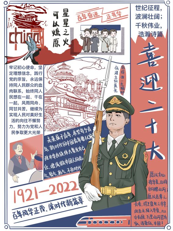 21级环境设计中外专业的赵雨璇同学选取了“‘辽宁舰’试航成功”、“航空航天事业再创新高”等作为画面构图的主题部分,介绍了中国人民在中国共产党的领导下取得的辉煌成就,展现了中华民族奋勇向前、敢为人先的奋斗精神。