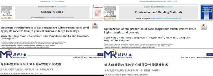 该篇硕士学位论文利用抗侵蚀性能较好的新型胶凝材料碱式硫酸镁水泥与珊瑚骨料复合,研究了人工复配珊瑚砂级配对碱式硫酸镁水泥基珊瑚砂浆性能的影响;基于梯度复合原理,使用碱式硫酸镁水泥的外加剂对珊瑚骨料进行了改性处理;并将制备的高强碱式硫酸镁水泥基珊瑚砂浆与珊瑚骨料复合,制备了具有良好力学性能及抗侵蚀性能的碱式硫酸镁水泥基全珊瑚混凝土,探究了Mg2+、Na+、Cl-、SO42-等侵蚀介质对碱式硫酸镁水泥基全珊瑚混凝土耐久性能的影响。楚英杰同学硕士期间先后在Composites Part B: Engineering (中科院JCR一区,IF: 11.322)、Construction and Building Materials (中科院JCR一区,IF: 7.693)等刊物上发表4篇高水平学术论文,并获得1项国家发明专利授权,目前该生已在东南大学材料科学与工程学院继续攻读博士学位。