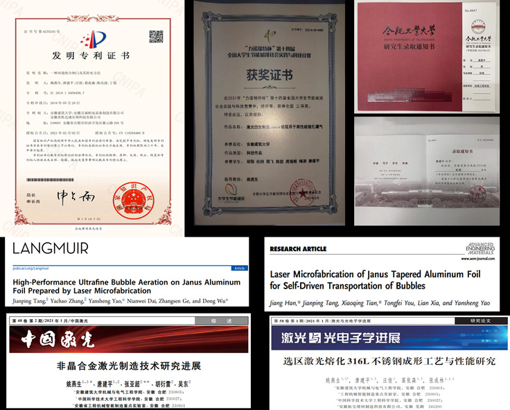 唐建平入学伊始,姚老师便商量选派其到科大吴东教授激光加工团队学习,通过双方协商,落实了联合培养模式。在其个人不懈的努力和教师团队的精心指导下,唐建平取得了丰富的学术成果:先后在LANGMUIR(JCR 2区,IF:4.331)、Advanced Engineering Materials(JCR 2区,IF:4.122)、中国激光、激光与光电子学进展等期刊发表了4篇高水平论文,并获得1项国家发明专利授权;分别在全国大学生节能减排大赛、安徽省挑战杯大赛以及互联网+大赛中均获得三等奖。目前该生已经在合肥工业大学机械工程学院继续攻读博士学位。