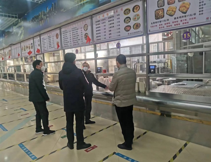 程雪涛一行深入学校食堂,实地查看食堂环境卫生、“明厨亮灶”建设、疫情防控等方面情况,现场详细了解食堂食品采购、进货台账、食品储存、加工制作、食品留样、餐具消毒等方面内容,现场与张亚新就高校食堂食品安全工作进行交流,对如何做好学校食品安全工作提出建设性意见和建议。