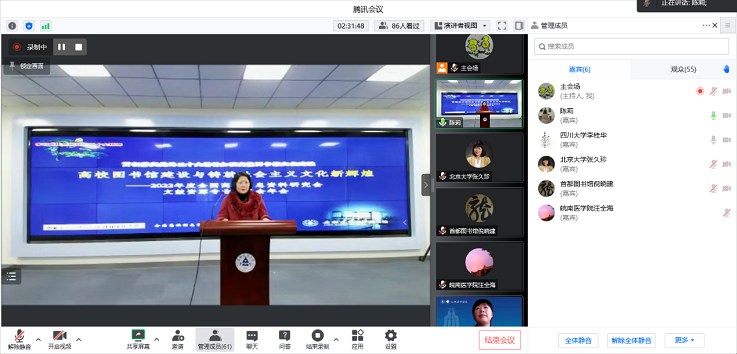 本次年会荣幸邀请到国家社会科学基金学科评审组成员、文化和旅游部公共文化服务专家委员会委员、文化和旅游部文化发展中心基层公共数字文化服务研究院院长倪晓建教授;北京大学信息管理系党委书记、主任,国务院学位委员会第八届学科评议组成员、文献资源专业委员会学术委员会主任张久珍教授;四川大学公共管理学院教授,博士生导师,中国索引学会理事李桂华教授;安徽大学图书馆馆长、安徽省高等学校图书馆情报工作委员会秘书长储节旺教授,围绕“高校图书馆建设与铸就社会主义文化新辉煌”主题,以线上的方式进行了专家主题学术报告。