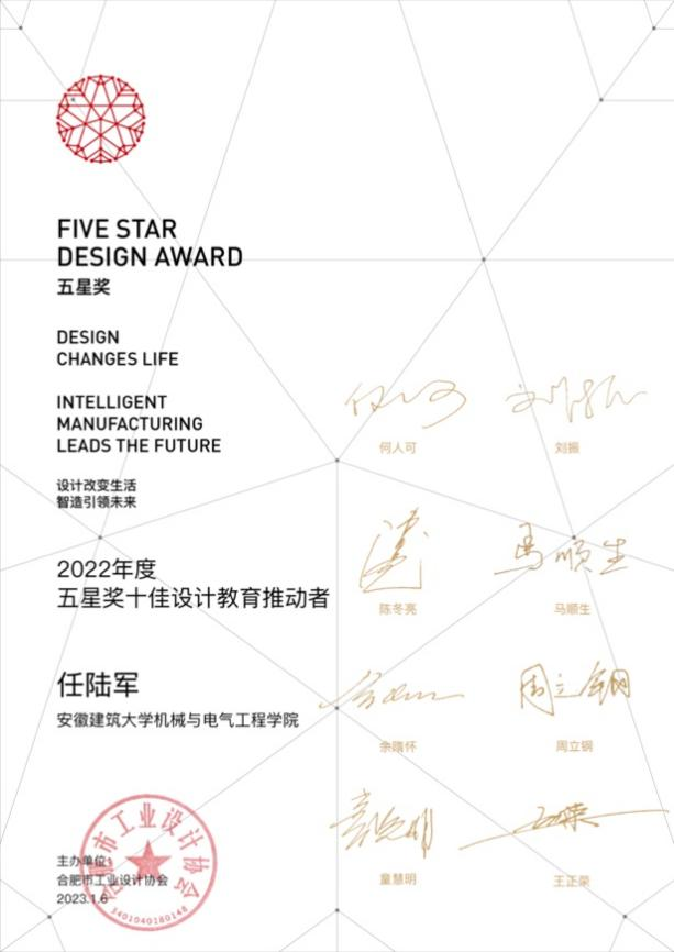 近日,由安徽省经济和信息化厅指导、合肥市工业设计协会主办的2022年度五星奖十佳工业设计奖揭晓,我校机电学院工业设计系教师任陆军获五星奖十佳设计教育推动者称号。