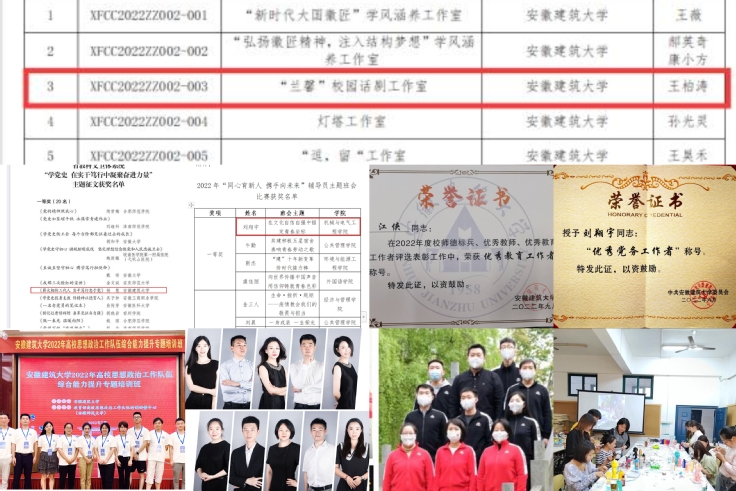 申报国家级学风涵养工作室1项,校级党建课题立项1项。1人在“学党史 在实干笃行中凝聚奋进力量”主题征文比赛中获安徽省一等奖,2人获校三等奖,1人在学校教师硬笔字及粉笔板书比赛中获校二等奖,在“同心育新人携手向未来”辅导员主题班会比赛中获一等奖1人、二等奖1人,3人申报讲师均获评,1人获评大创项目优秀指导教师,1人获校“优秀工会干部”,1人获校“优秀党务工作者”,1人获校“优秀教育工作者”,队伍建设取得扎实成效。