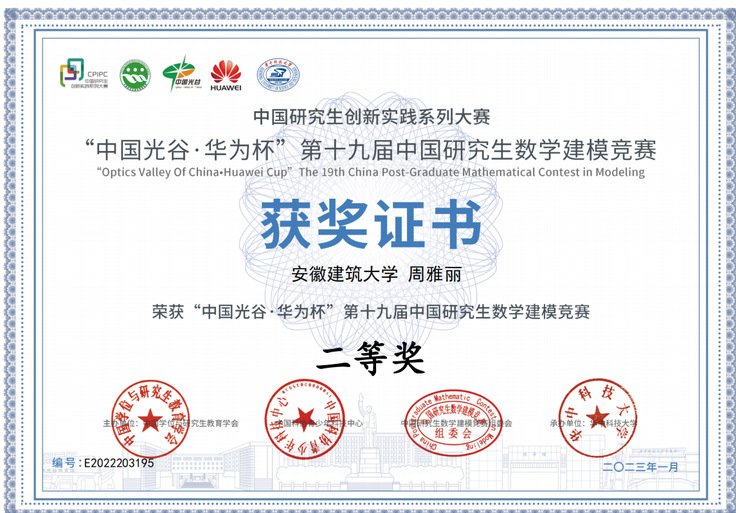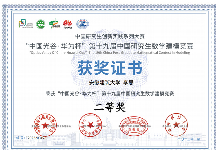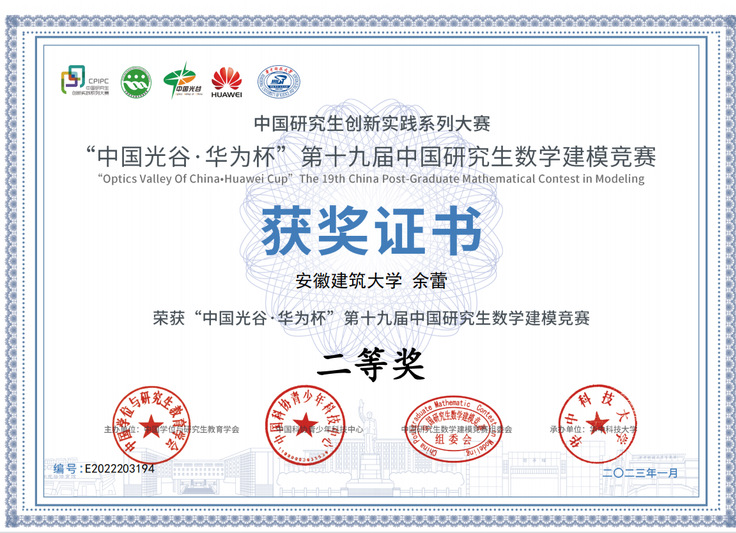 2022年“中国光谷·华为杯”第十九届中国研究生数学建模竞赛结果于近日揭晓,我校共有26支队伍参赛,其中荣获全国二等奖1项,三等奖2项。本次大赛共吸引国内外共465个研究生培养单位的17970队研究生参赛,一等奖获奖比例仅为1.10%,二等奖获奖比例为13.36%,三等奖获奖比例18.58%,总获奖比例33.03%。