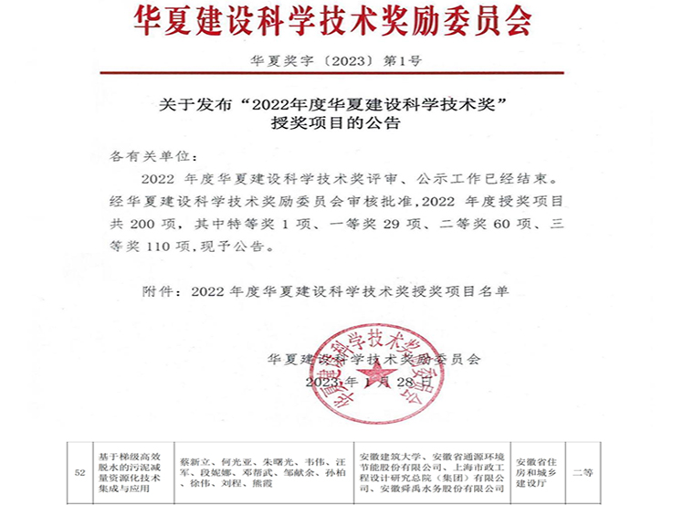 本网讯 近日,2022年度华夏建设科学技术奖获奖项目名单揭晓。我校蔡新立教授作为第一完成人的研究成果“基于梯级高效脱水的污泥减量资源化技术集成与应用”荣获二等奖。