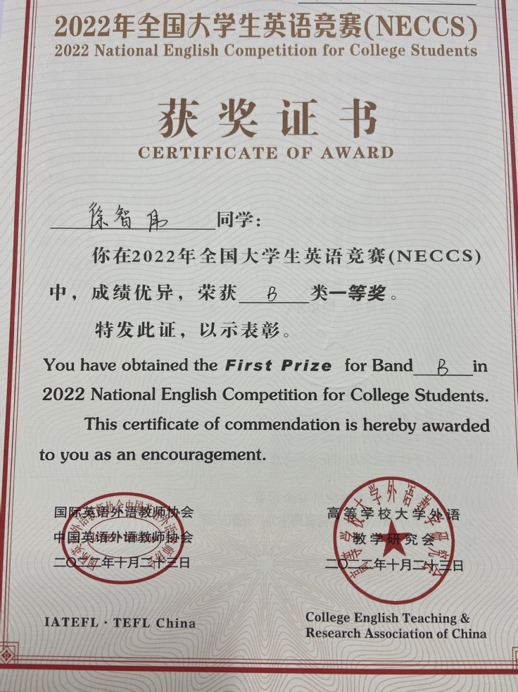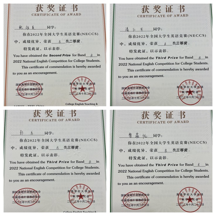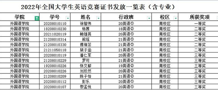 本网讯 近日,2022年全国大学生英语竞赛成绩揭晓,外国语学院2020级英语专业学生徐智伟获得全国一等奖,2020级英语专业鲍雄英等五名同学获得二等奖,2019级英语专业张文都等七名同学获得三等奖。与此同时,10位老师获得“优秀指导教师”荣誉称号。