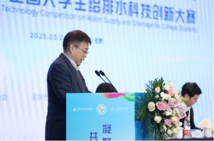 深圳环境水务集团有限公司吴晖董事长致辞,他提出,水是人类共同的事业,深圳环水集团一直致力于用科技创新推动水处理行业发展,厚植创新基因、集聚创新动力、提升创新活力并结合水务集团“AOA耦合厌氧氨氧化技术”“深水云脑”“冰浆清洗技术”等技术发展案例,强调科技创新对于给排水工作的提升有着至关重要的意义。在水处理行业科技蓬勃发展的时期,希望通过大赛激励给排水专业的在校生释放创新潜能,激发创新活力,更鼓励参赛学生们跟上时代趋势,立于浪潮之尖,在“深水杯”的舞台上,充分展现实力、特色和亮点,赛出水平,赛出优异成绩。