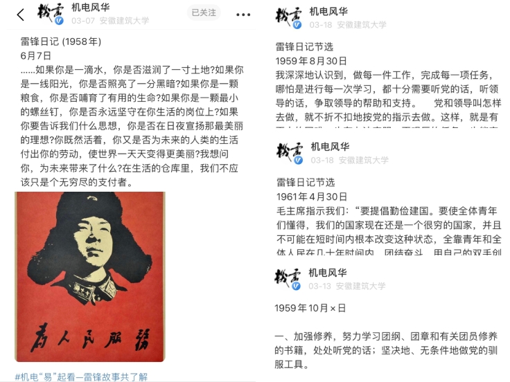 线上网络聚力,弘扬雷锋文化。学院秉承“雷锋在线,再现雷锋”的理念,以讲好雷锋故事、研究雷锋文化为目标,易班平台通过“机电‘易’起看——雷锋故事共了解”板块推送雷锋生平、雷锋日记和雷锋先进事迹,突出知识性和时代性,形成学雷锋主题教育和网络育人相融合的育人格局。