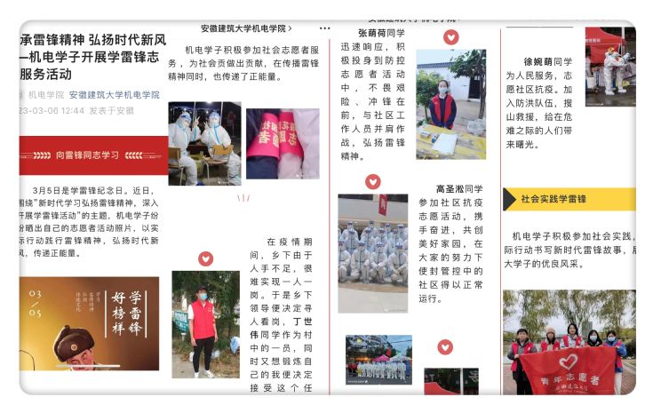 榜样力量无穷无尽,思悟践行与时俱进。学院广泛开展学雷锋先进典型的挖掘、选树和学习宣传活动,同步发声、同向发力,鼓励更多学生续写雷锋故事,传承雷锋精神,将奉献作为持之以恒的行动自觉。