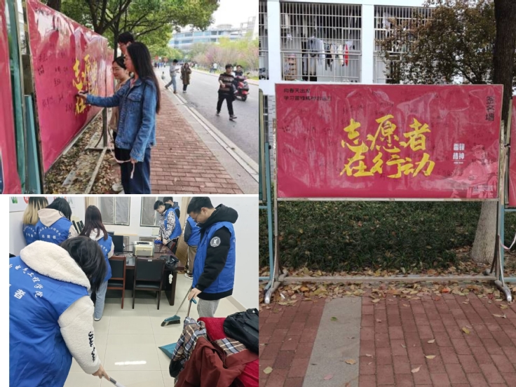 践行雷锋行动,用爱心续写雷锋故事。3月8日,学院学生会工作人员带领机电蓝马甲志愿者来到机电楼办公室开展义务劳动活动。大家相互合作,合理分工,积极配合,不怕脏不怕累,为创建文明卫生的机电楼贡献出自己的一份力量。3月21日,学院研究生成立志愿服务小组举办经验分享交流会,帮助19级考研学生做好复试准备。他们结合自身考研复试经历,围绕联系导师、专业课备考、复试调剂和心态调整等方面进行了分享,现场答疑解惑。22级机械专业研究生胡基波同学说:“雷锋同志告诉我们一滴水只有放进大海里才永远不会干涸。在奉献和服务中生命才会有更大的价值和意义。考研的路上曾经有老师和学长无私的帮助过我们,我们也愿意传承这份奉献与爱心帮助学弟学妹。”学院在学校内安放“志愿者在行动”宣传板和签名板,呼吁同学们以实际行动践行雷锋精神。