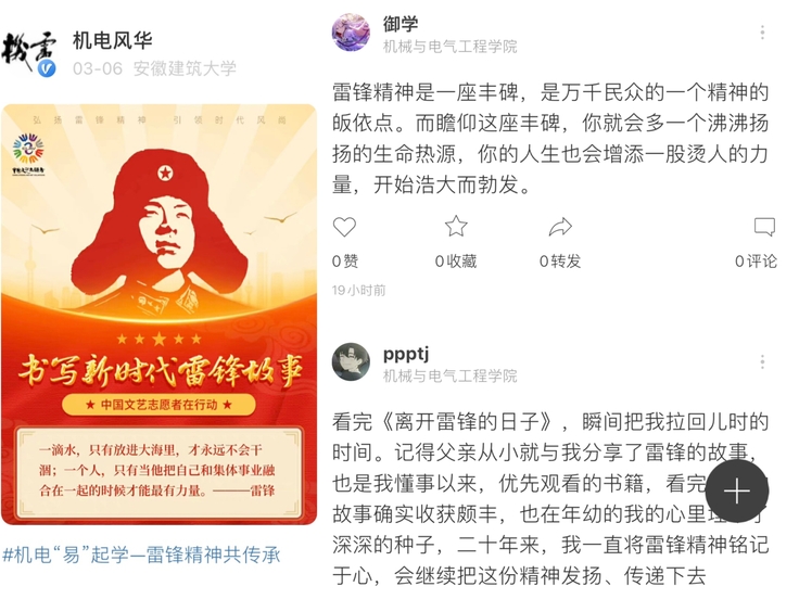 宣传积极正能量,用网络平台铸魂育人。学院易班开展“机电‘易’起做——雷锋品质共赓续”活动,邀请师生参与话题讨论,参加学雷锋志愿打卡活动,提倡用镜头记录身边学雷锋的好人好事。微信公众号开设“学习雷锋好榜样”专栏介绍身边雷锋人的先进个人事迹,树立可学可做、可追可及的道德标杆。19机电专业的张春杨同学说:“通过学院易班和公众号我发现原来身边有这么多的雷锋式人物。他们都激励我们要崇德向善、见贤思齐,自发加入学雷锋的时代方阵,自觉将雷锋精神转化为爱党爱国的奋斗动力,肩负起新时代赋予的青春使命。”