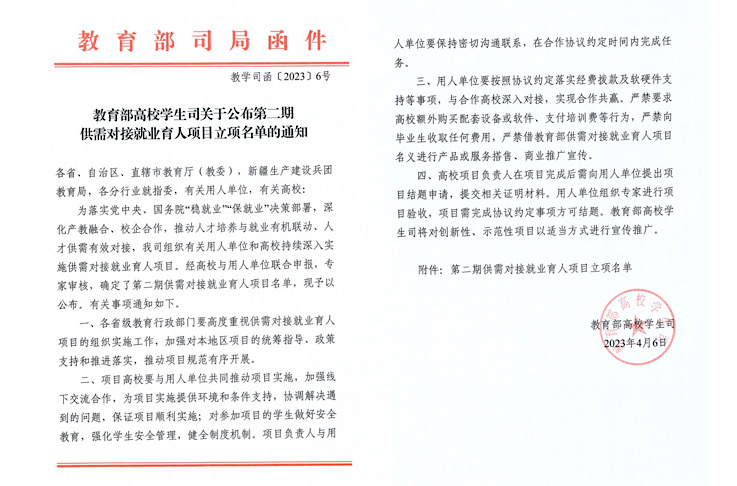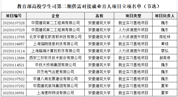 本网讯 近日,教育部高校学生司《关于公布第二期供需对接就业育人项目立项名单的通知》(教学司函〔2023〕6号)文件公布了第二期供需对接就业育人项目立项名单。经校企多轮洽谈与对接、学校申请,学校6名老师申报的11个项目获得立项,其中人力资源提升项目3项、就业实习基地项目8项。项目合作分别为中国建筑第二工程局有限公司、中铁大桥局集团有限公司、中建八局发展建设有限公司、北京中睿在职言职科技有限公司等10家企业。