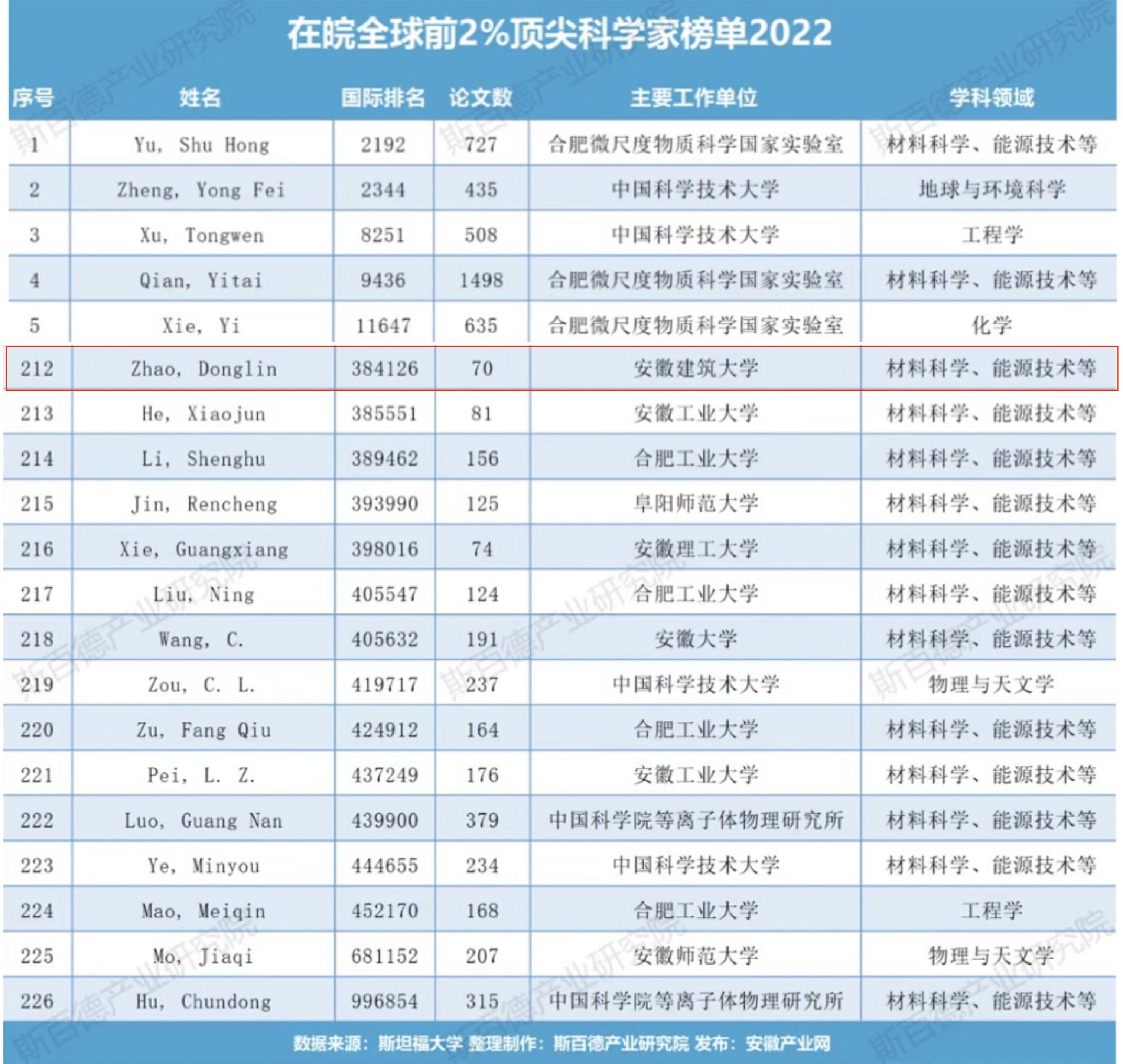 本网讯 近日,斯坦福大学发布了2022年度全球前2%顶尖科学家榜单,共有226位在皖学者入围全球前2%顶尖科学家,学校材料与化学工程学院教授赵东林发表论文数量70篇、以国际排名384126位入选。