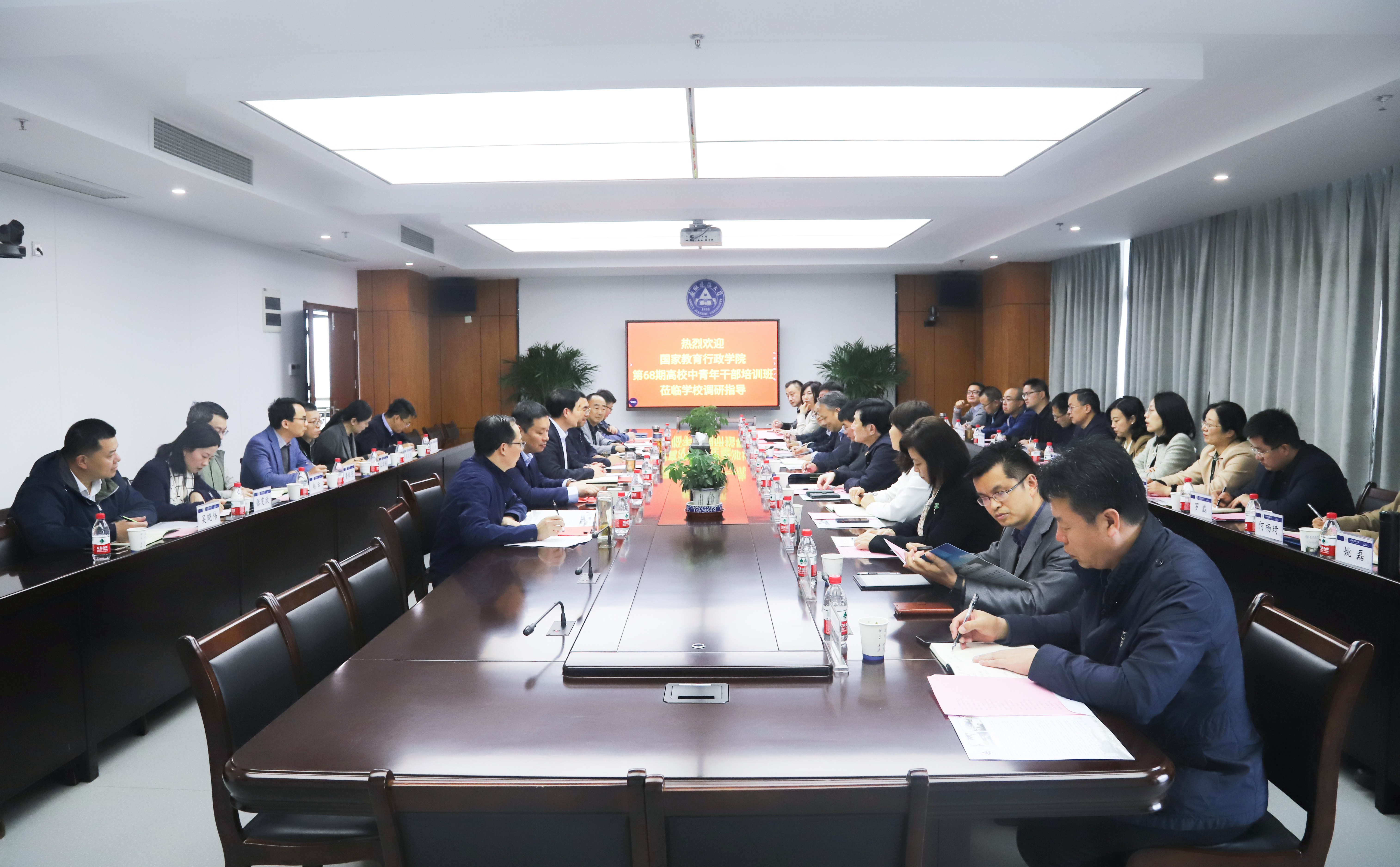 本网讯 4月25日,国家教育行政学院2023年春季第68期高校中青年干部培训班安徽考察团一行30余人在考察团团长石连海带领下莅临我校,开展 “地方高校一流学科建设与人才培养的实践探索”主题考察调研活动。校党委副书记、校长黄显怀热情接待考察团一行,校党委常委、副校长蔡国军主持座谈会。办公室、发展规划处、人事处、科学技术处(产学研合作办公室)等相关部门负责人参加会议。