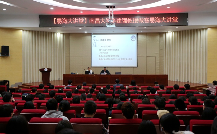 本网讯 4月27日,南昌大学李建强教授做客ku游官方第96期易海大讲堂,为学校师生带来了一场题为“制造业集聚如何影响绿色经济效率?”的精彩报告。报告会由校党委常委、副校长闵杰教授主持,经济与管理学院领导班子、部分骨干教师、研究生和本科生共计200余人参加了报告会。