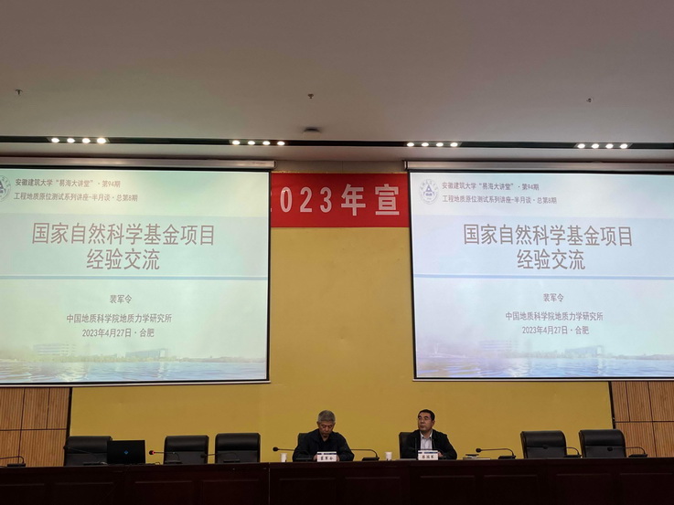 本网讯 4月27日下午,由校党委宣传部主办,安徽省智能地下探测技术研究院、ku游官方土木工程学院承办的第94期“易海大讲堂”在南校区实验综合楼二楼报告厅举行。中国地质科学院地质力学研究所裴军令研究员做客“易海大讲堂”,并做题为《国家自然科学基金项目经验交流》的报告,会议由校党委常委、副校长蔡国军教授主持,土木工程学院执行院长张宁教授、副院长陈东教授、安徽省智能地下探测技术研究院老师出席大会。