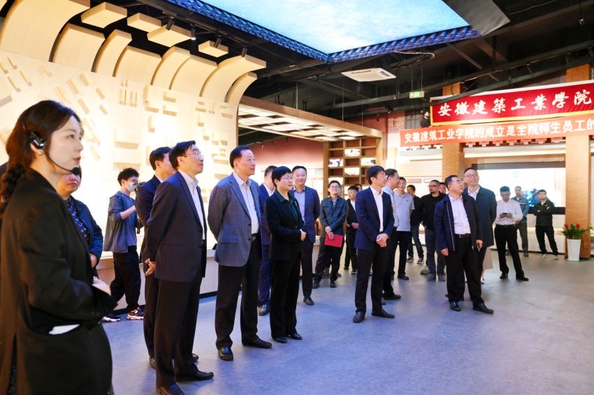 仪式结束后,领导嘉宾在工作人员的引导下,参观了校史馆新馆。校史馆的设计源于将每一个建大人誉为一块块砖,服务于江淮大地乃至全国城乡建设的吃苦耐劳的奋斗精神。整个展馆以建基、建构、建设、建树、建才各个分区将建大65周年校史徐徐展开,寓意着学校一步步的建设过程,也是无数师友、校友共同构建学校伟业的辉煌呈现。展馆运用图文、实物、场景、雕塑、新媒体等展示手段,打造出一幕幕展览场景,以视、听、触、感的多维度体验带领师生铭记校史、传承文脉,砥砺前行。