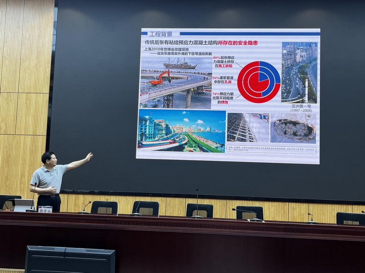 报告开始前,熊学玉教授对ku游官方65周年校庆表示热烈祝贺并分享了自己在母校求学时的经历,对母校青年学子的学习与科研工作提出了宝贵意见。报告中,熊学玉教授首先联系实际工程分析了传统后张有粘结预应力混凝土结构所存在的安全隐患。随后介绍了自己团队在缓粘结预应力混凝土结构的精细化有限元模拟方法以及性能试验等方面的研究,并结合上海崇明花博会世纪馆项目、上海大歌剧院项目等阐述了超高性能预应力结构体系理论在重点工程中的应用。