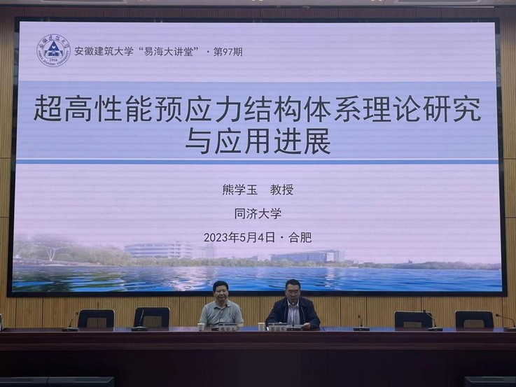 本网讯 5月4日下午,由校党委宣传部主办,土木工程学院承办的第97期“易海大讲堂”在南校区实训综合楼二楼报告厅举行。我校工民建专业82级优秀校友、同济大学熊学玉教授做客“易海大讲堂”,作了题为《超高性能预应力结构体系理论研究与应用进展》的报告。会议由校党委常委、副校长蔡国军主持,部分教师、研究生和本科生代表参加讲座。