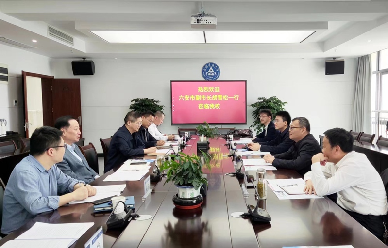 本网讯 5月7日,六安市副市长胡雪松、住建局党组书记钟庆华、住建局总工程师吴耘一行来校交流。校党委常委、副校长蔡新立主持座谈会,科技成果转化处、科技处、节能院相关负责人参加。
