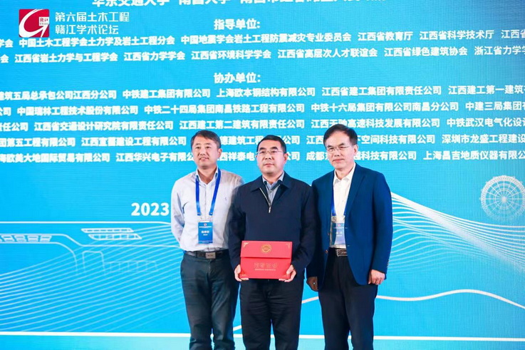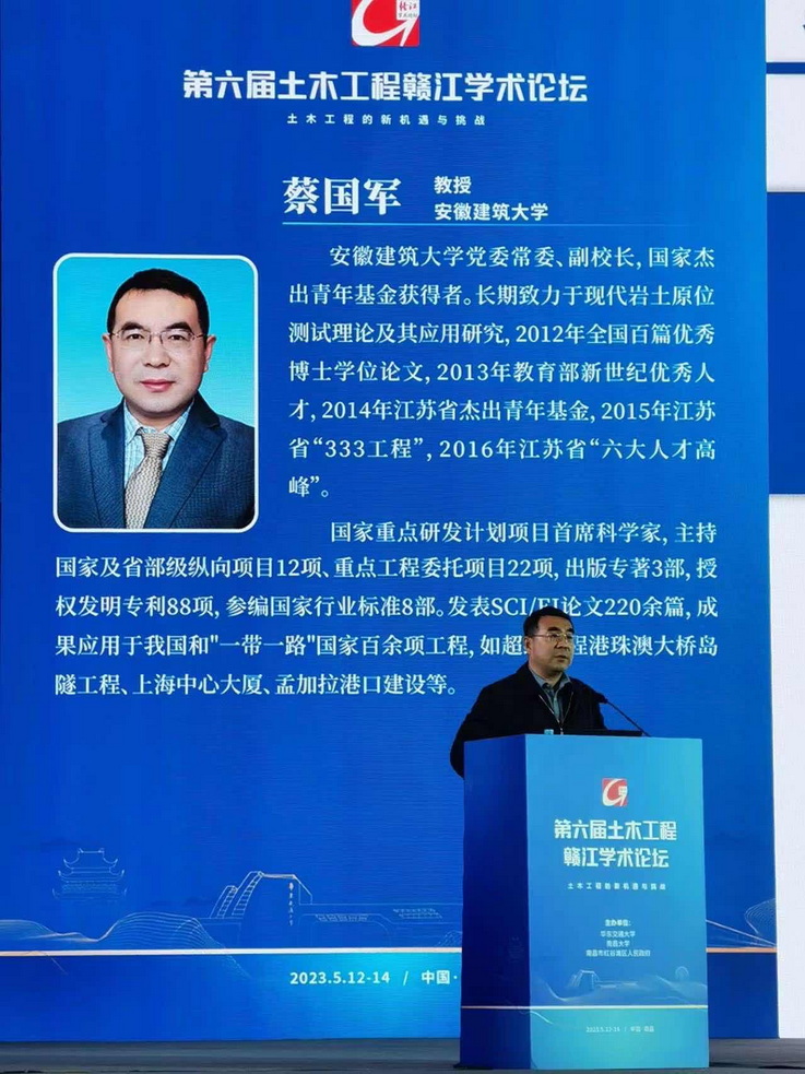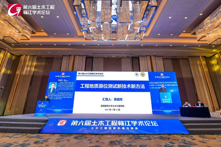 大会聚焦“土木工程的新机遇与挑战”这一主题,深入探讨土木工程发展面临的新问题,积极寻求解决思路,助力我国土木行业向绿色化、智慧化、韧性化转型发展。蔡国军教授以《工程地质原位测试新技术新方法》为题作大会特邀报告,在报告中,基于地震波触探的地基土动力特性评价方法以及基于电阻率触探的污染土评价方法等多方面介绍了多功能岩土工程CPTU原位测试系统,同时介绍了研究成果在现场的应用情况,并宣传介绍了第一届国际岩土工程原位测试论坛。
