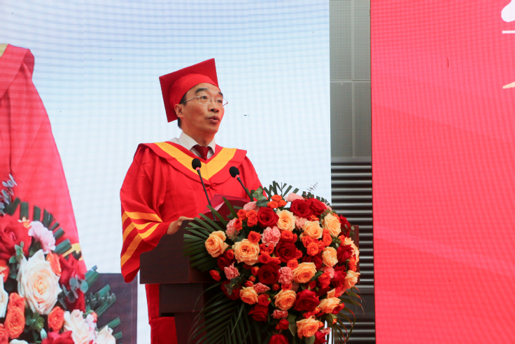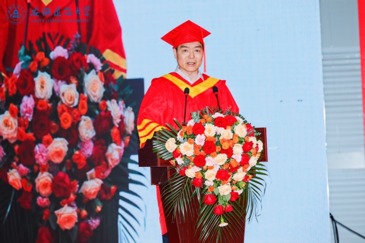 校党委副书记、校长黄显怀教授在典礼上致辞。他代表学校向5000余名2023届毕业生表示热烈的祝贺,向辛勤培育同学们的父母和老师、亲友致以衷心的感谢。随后,他向全体毕业生表达了赞许和感谢:“经历了疫情,你们在彷徨中崛起,在自强中破茧,成长为更优秀的自己!你们见证了学校的高质量发展,办学特色日益鲜明突出、人才强校战略布局良好、学科建设成绩斐然、国际交流迈上新台阶,学校实现了博士学位授予单位从无到有和一级学科博士点“零”的突破。”