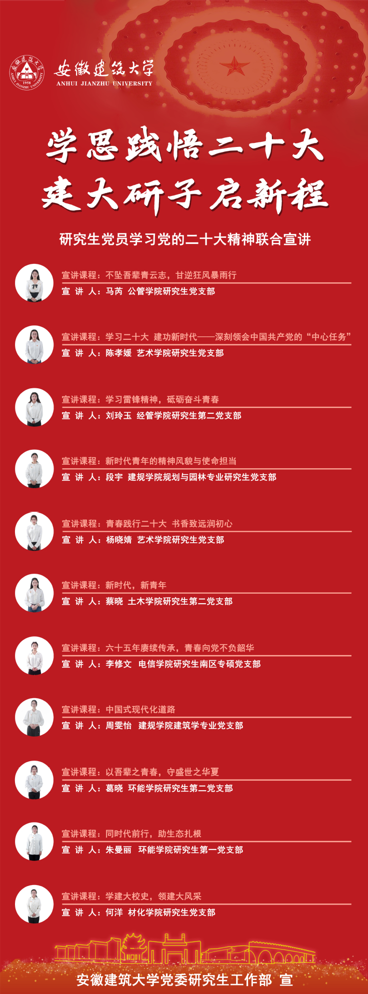 二是以思想文化为引领,结合研究生不同学科背景,紧紧围绕党的二十大精神,深度挖掘校本文化内涵,研工部精心遴选、培育组建“研究生党员宣讲团”,建设一批学习宣讲党的二十大精神微党课,通过“学以致用、讲学互动、以讲促学”的自我教育和浸润发展机制,计划培养和挖掘一批优秀研究生理论宣讲骨干,并在全校掀起青年宣讲理论的热潮,推动研究生自觉传承ku游官方“进德、弘毅、博学、善建”校训精神,以实际行动庆祝学校65周年校庆。