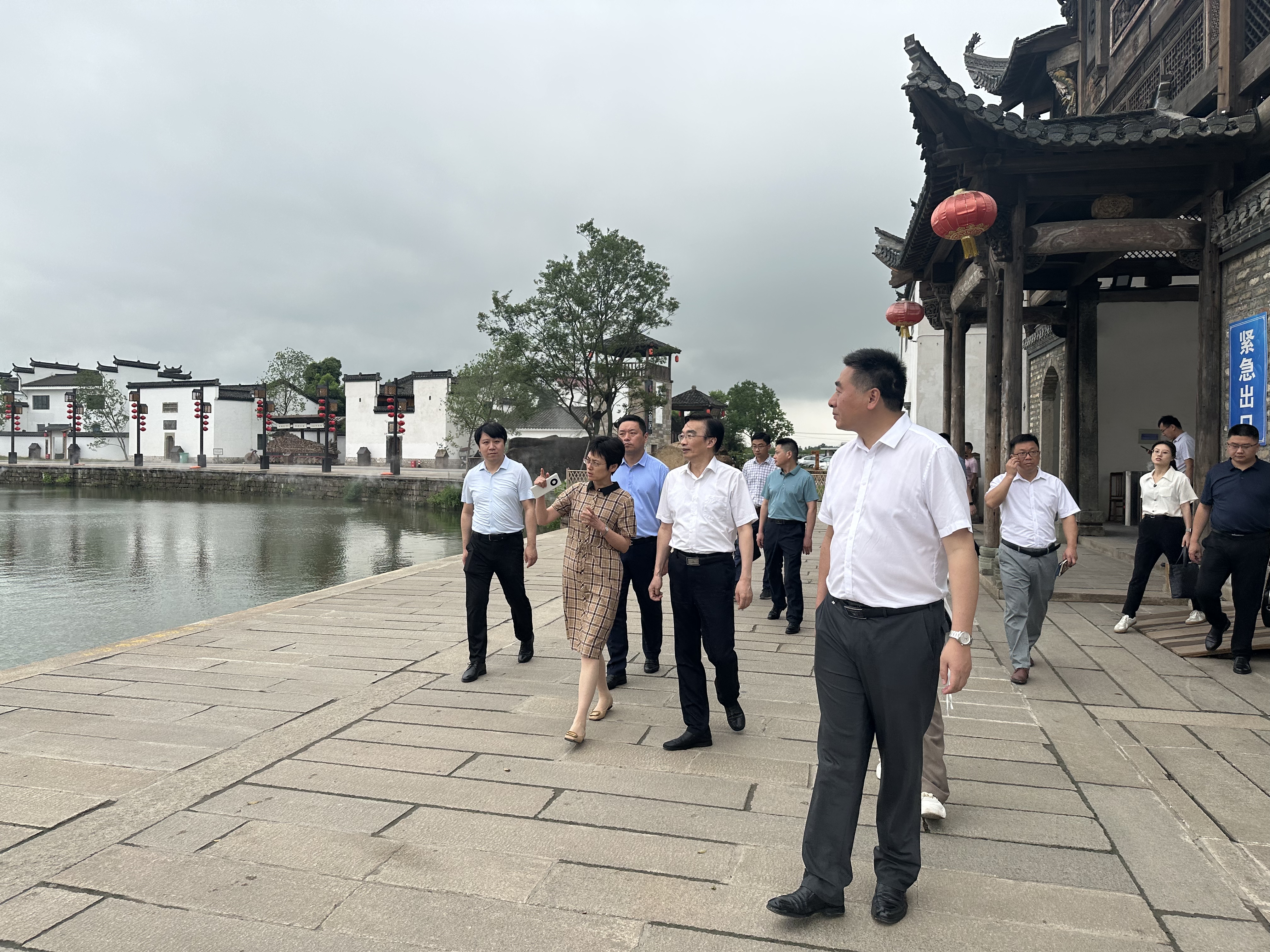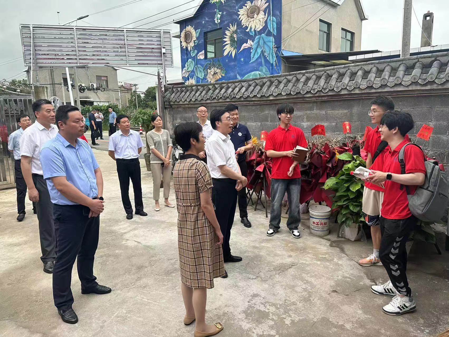 孙道胜一行先实地查看实践团队活动开展的情况,与团队成员和村民进行了亲切的交流,孙道胜对团队成员高昂的精神状态和扎实的工作态度给予高度评价。随后,杨文萍带领大家参观犁桥水镇,介绍犁桥水镇项目的开发与前期规划。