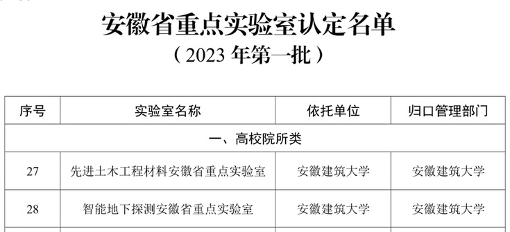 本网讯 近日,安徽省科学技术厅印发《关于认定“数字安全”等66家安徽省重点实验室的通知》(皖科基地秘〔2023〕238号),我校省重点实验室再创佳绩,“先进土木工程材料安徽省重点实验室”“智能地下探测安徽省重点实验室”获得批准认定,这标志着我校在先进土木工程材料、智能地下探测方面的深化创新有了新的省部级平台。