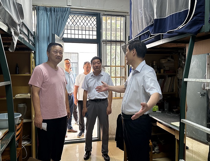 在学生公寓,黄显怀实地查看了学生浴室等住宿环境,听取国资处负责人关于北校区规划方案的汇报。