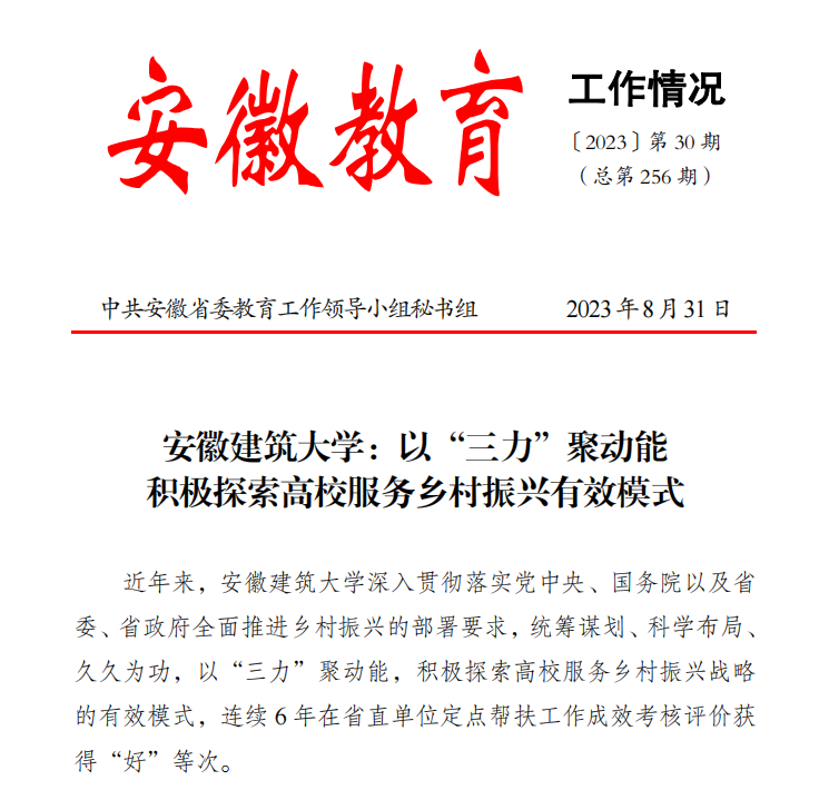 本网讯 近日,《安徽教育工作情况(〔2023〕第30期)》以“ku游官方:以‘三力’聚动能 积极探索高校服务乡村振兴有效模式”为题,专题宣传学校乡村振兴工作成效。