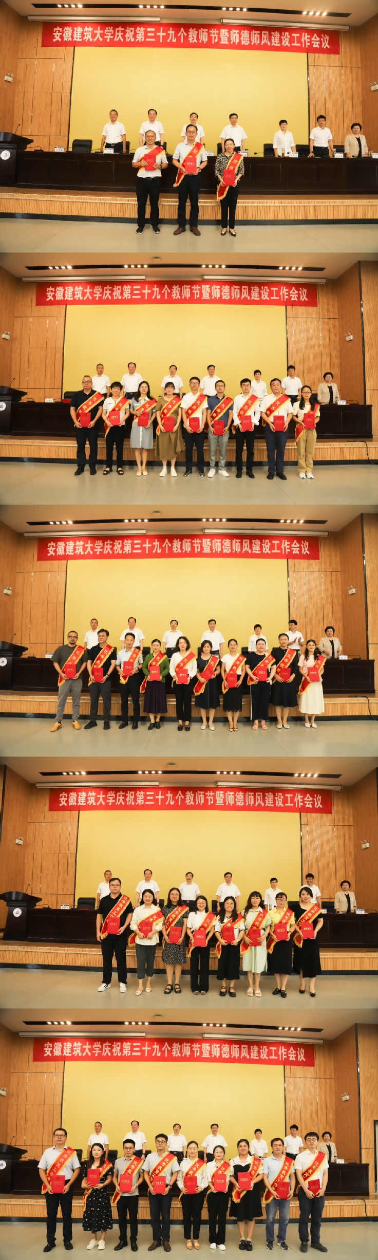 公管学院马晓艳老师、环能学院张瑾老师、艺术学院黄成老师、档案馆汪伟老师、土木学院洪秋阳老师分别代表安徽省最美教师荣誉获得者、师德标兵、优秀教师、优秀教育工作者和新进教师进行交流发言。